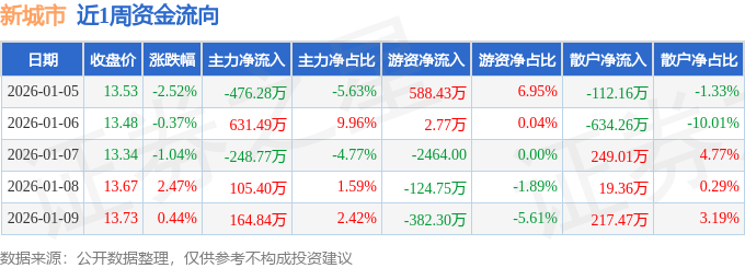 资金流向数据方面,本周新城市主力资金合计净流入176.68万元,游资资金合计净流入83.9万元,散户资金合计净流出260.58万元。本周资金流向一览见下表: