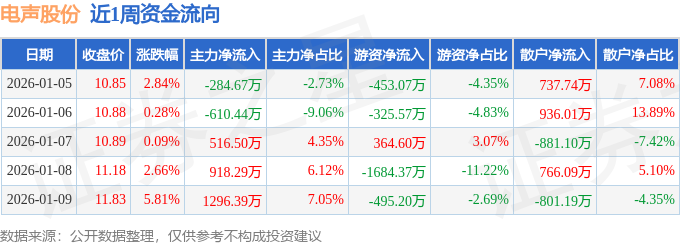 资金流向数据方面,本周电声股份主力资金合计净流入1836.07万元,游资资金合计净流出2593.61万元,散户资金合计净流入757.54万元。本周资金流向一览见下表: