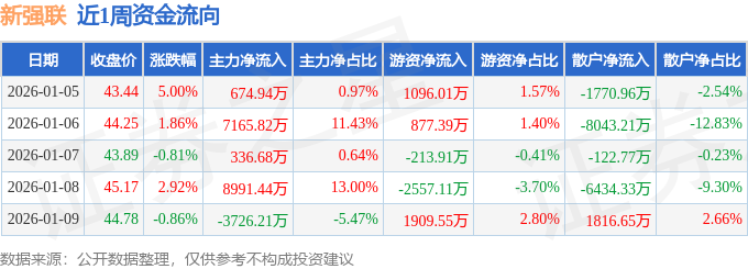 资金流向数据方面,本周新强联主力资金合计净流入1.34亿元,游资资金合计净流入1111.94万元,散户资金合计净流出1.46亿元。本周资金流向一览见下表: