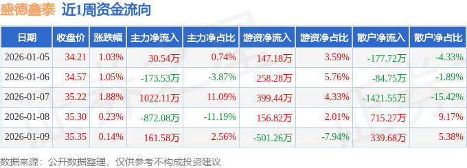 资金流向数据方面,本周盛德鑫泰主力资金合计净流入168.62万元,游资资金合计净流入460.46万元,散户资金合计净流出629.07万元。本周资金流向一览见下表: