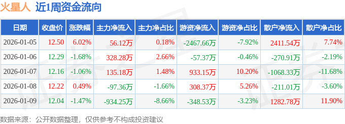 资金流向数据方面,本周火星人主力资金合计净流出512.02万元,游资资金合计净流出1632.05万元,散户资金合计净流入2144.07万元。本周资金流向一览见下表: