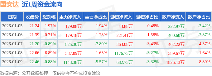 资金流向数据方面,本周国安达主力资金合计净流出1023.32万元,游资资金合计净流出1231.13万元,散户资金合计净流入2254.45万元。本周资金流向一览见下表: