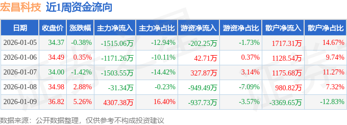 证券之星消息,截至2026年1月9日收盘,宏昌科技(301008)报收于36.82元,较上周的34.5元上涨6.72%。本周,宏昌科技1月9日盘中最高价报37.36元。1月8日盘中最低价报33.73元。宏昌科技当前最新总市值48.22亿元,在家电零部件板块市值排名15/30,在两市A股市值排名3567/5182。