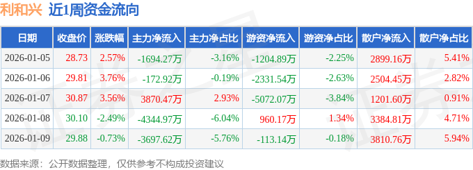 资金流向数据方面,本周利和兴主力资金合计净流出6039.31万元,游资资金合计净流出7761.47万元,散户资金合计净流入1.38亿元。本周资金流向一览见下表: