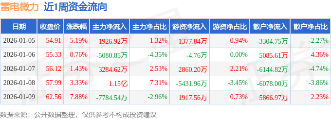 资金流向数据方面,本周雷电微力主力资金合计净流入3856.11万元,游资资金合计净流入718.88万元,散户资金合计净流出4574.98万元。本周资金流向一览见下表: