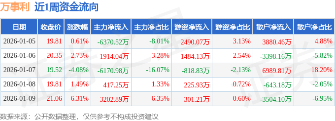 资金流向数据方面,本周万事利主力资金合计净流出7007.32万元,游资资金合计净流入3682.5万元,散户资金合计净流入3324.82万元。本周资金流向一览见下表: