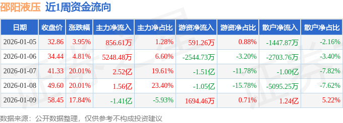 资金流向数据方面,本周邵阳液压主力资金合计净流入3.28亿元,游资资金合计净流出2.59亿元,散户资金合计净流出6856.32万元。本周资金流向一览见下表: