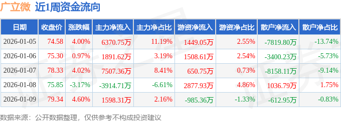 资金流向数据方面,本周广立微主力资金合计净流入1.35亿元,游资资金合计净流入5500.98万元,散户资金合计净流出1.9亿元。本周资金流向一览见下表: