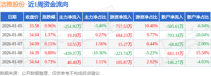 资金流向数据方面,本周洁雅股份主力资金合计净流出578.24万元,游资资金合计净流入1341.16万元,散户资金合计净流出762.93万元。本周资金流向一览见下表: