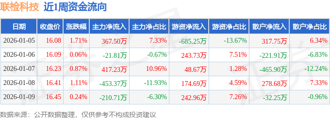 资金流向数据方面,本周联检科技主力资金合计净流入98.84万元,游资资金合计净流入24.8万元,散户资金合计净流出123.64万元。本周资金流向一览见下表: