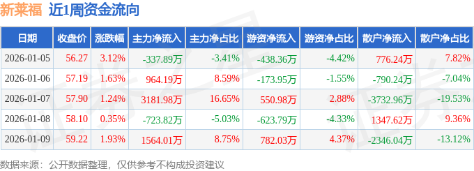 资金流向数据方面,本周新莱福主力资金合计净流入4648.47万元,游资资金合计净流入96.91万元,散户资金合计净流出4745.38万元。本周资金流向一览见下表: