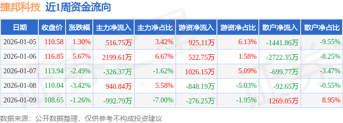 资金流向数据方面,本周捷邦科技主力资金合计净流入2338.03万元,游资资金合计净流入1349.55万元,散户资金合计净流出3687.58万元。本周资金流向一览见下表: