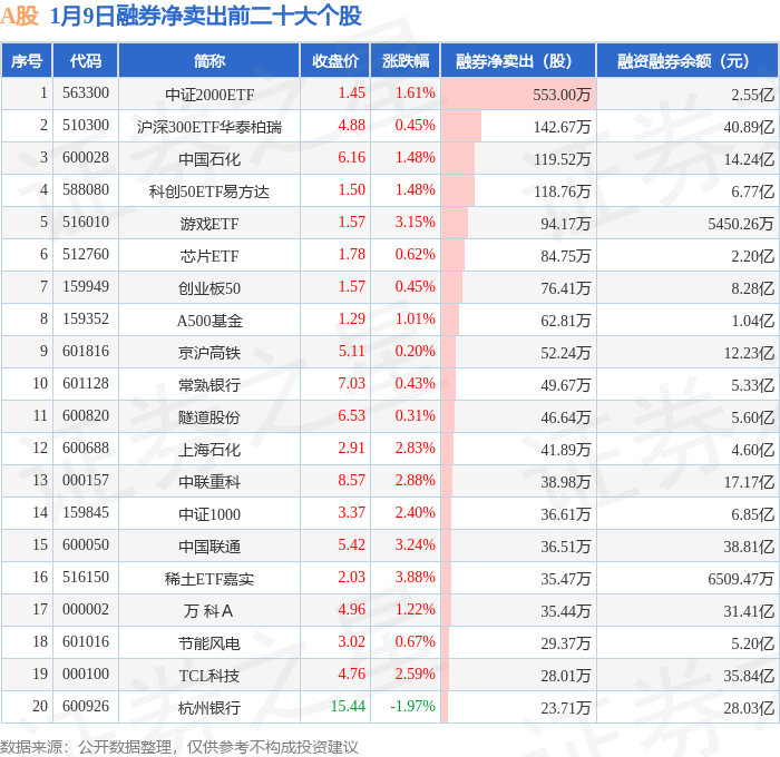 A股融券净卖出前三分别为:中证2000ETF(563300)融券净卖出553万股、沪深300ETF华泰柏瑞(510300)融券净卖出142.67万股、中国石化(600028)融券净卖出119.52万股,前20具体见下表: