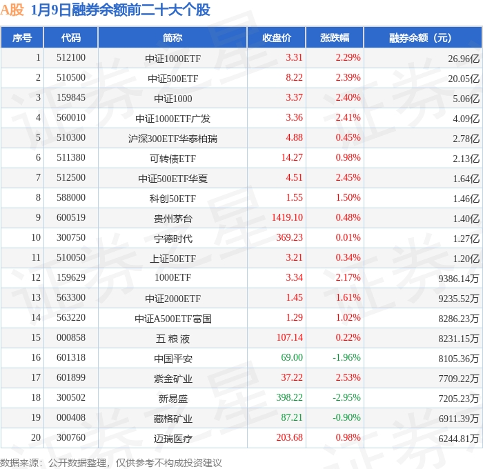 A股融券余额前三分别为:中证1000ETF(512100)融券余额26.96亿元、中证500ETF(510500)融券余额20.05亿元、中证1000(159845)融券余额5.06亿元,前20具体见下表: