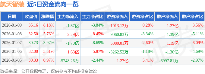 证券之星消息,截至2026年1月9日收盘,航天智装(300455)报收于35.16元,上涨8.18%,换手率14.32%,成交量101.51万手,成交额35.58亿元。