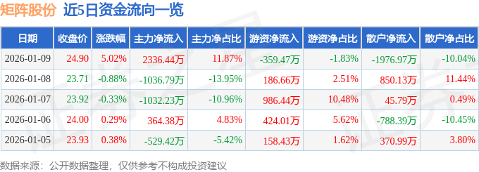 证券之星消息,截至2026年1月9日收盘,矩阵股份(301365)报收于24.9元,上涨5.02%,换手率7.87%,成交量7.98万手,成交额1.97亿元。