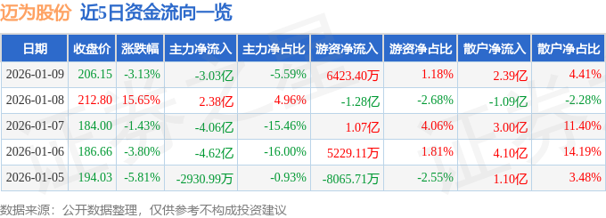 证券之星消息,截至2026年1月9日收盘,迈为股份(300751)报收于206.15元,下跌3.12%,换手率13.06%,成交量25.26万手,成交额54.23亿元。