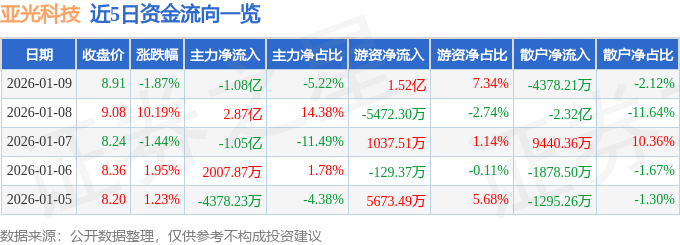 证券之星消息,截至2026年1月9日收盘,亚光科技(300123)报收于8.91元,下跌1.87%,换手率22.98%,成交量229.93万手,成交额20.69亿元。