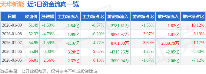 证券之星消息,截至2026年1月9日收盘,天华新能(300390)报收于51.49元,下跌1.59%,换手率5.18%,成交量34.87万手,成交额17.97亿元。