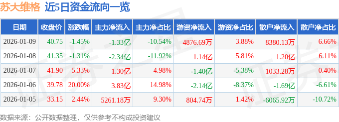 证券之星消息,截至2026年1月9日收盘,苏大维格(300331)报收于40.75元,下跌1.45%,换手率14.47%,成交量30.42万手,成交额12.58亿元。