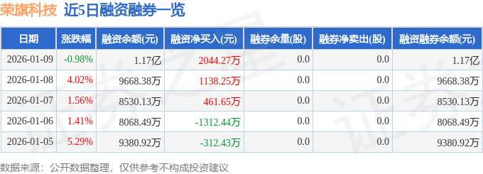荣旗科技融资融券信息显示,融资方面,当日融资买入3530.73万元,融资偿还1486.46万元,融资净买入2044.27万元,连续3日净买入累计3644.17万元。融券方面,融券卖出0.0股,融券偿还0.0股,融券余量0.0股,融券余额0.0万元。融资融券余额1.17亿元。