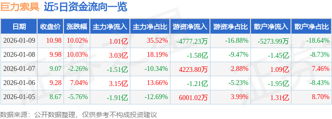 证券之星消息,截至2026年1月9日收盘,巨力索具(002342)报收于10.98元,上涨10.02%,已连续涨停2天,换手率2.7%,成交量25.77万手,成交额2.83亿元。