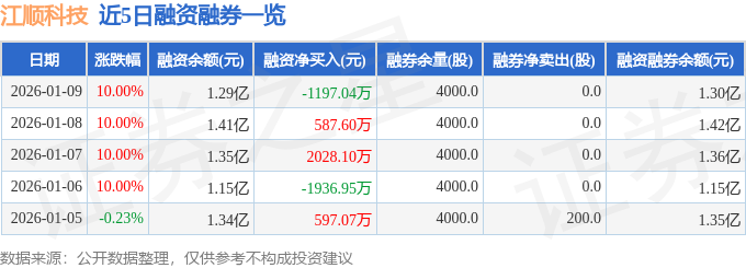 证券之星消息,截至2026年1月9日收盘,江顺科技(001400)报收于113.59元,上涨10.0%,已连续涨停4天,换手率27.32%,成交量4.1万手,成交额4.45亿元。
