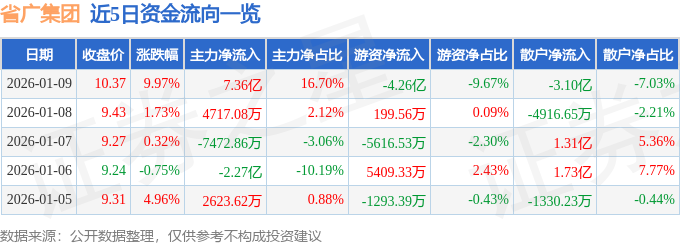 1月9日的资金流向数据方面,主力资金净流入7.36亿元,占总成交额16.7%,游资资金净流出4.26亿元,占总成交额9.67%,散户资金净流出3.1亿元,占总成交额7.03%。