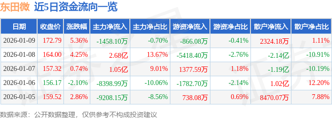 证券之星消息,截至2026年1月9日收盘,东田微(301183)报收于172.79元,上涨5.36%,换手率22.11%,成交量12.98万手,成交额20.95亿元。