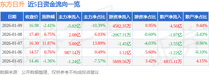 证券之星消息,截至2026年1月9日收盘,东方日升(300118)报收于16.98元,下跌2.41%,换手率29.3%,成交量271.55万手,成交额48.33亿元。