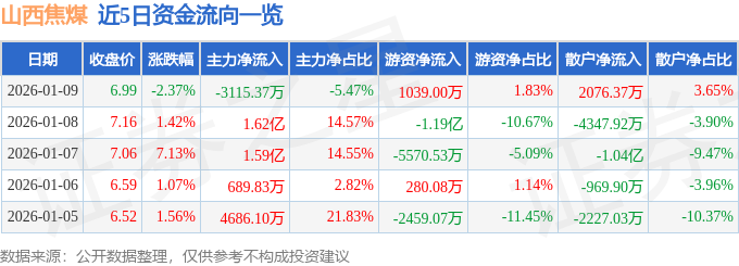 证券之星消息,截至2026年1月9日收盘,山西焦煤(000983)报收于6.99元,下跌2.37%,换手率1.75%,成交量81.39万手,成交额5.69亿元。