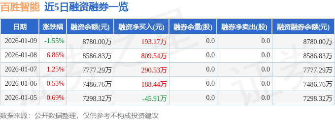 百胜智能融资融券信息显示,融资方面,当日融资买入1620.39万元,融资偿还1427.22万元,融资净买入193.17万元,连续3日净买入累计1293.23万元。融券方面,融券卖出0.0股,融券偿还0.0股,融券余量0.0股,融券余额0.0万元。融资融券余额8780.0万元。
