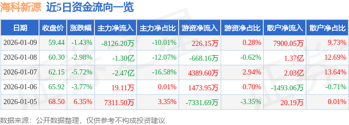 证券之星消息,截至2026年1月9日收盘,海科新源(301292)报收于59.44元,下跌1.43%,换手率15.91%,成交量13.54万手,成交额8.12亿元。