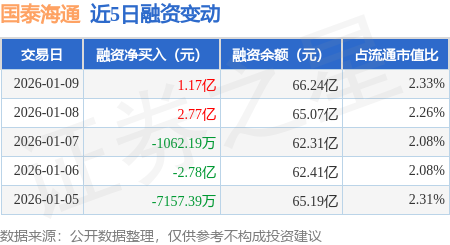 证券之星消息,1月9日,国泰海通(601211)融资买入3.99亿元,融资偿还2.82亿元,融资净买入1.17亿元,融资余额66.24亿元。