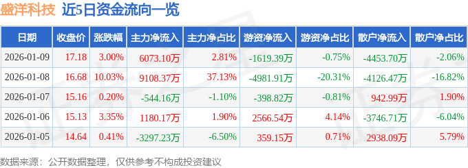 1月9日的资金流向数据方面,主力资金净流入6073.1万元,占总成交额2.81%,游资资金净流出1619.39万元,占总成交额0.75%,散户资金净流出4453.7万元,占总成交额2.06%。