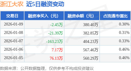 证券之星消息,1月9日,浙江大农(920855)融资买入60.63万元,融资偿还63.07万元,融资净卖出2.45万元,融资余额380.4万元。
