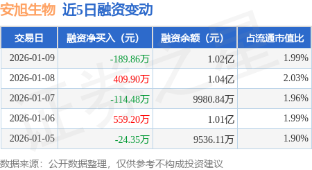 证券之星消息,1月9日,安旭生物(688075)融资买入352.92万元,融资偿还542.77万元,融资净卖出189.86万元,融资余额1.02亿元。
