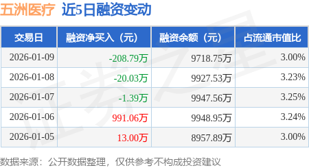 证券之星消息,1月9日,五洲医疗(301234)融资买入1698.56万元,融资偿还1907.35万元,融资净卖出208.79万元,融资余额9718.75万元。