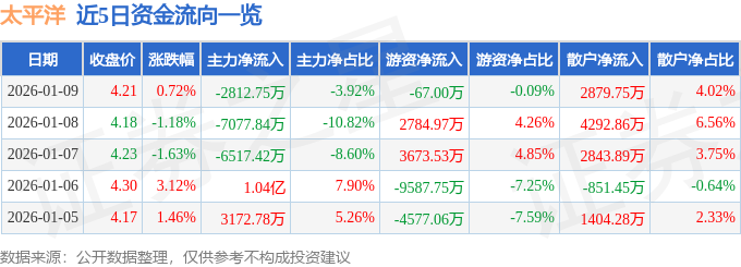 1月9日的资金流向数据方面,主力资金净流出2812.75万元,占总成交额3.92%,游资资金净流出67.0万元,占总成交额0.09%,散户资金净流入2879.75万元,占总成交额4.02%。
