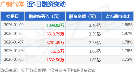 证券之星消息,1月9日,广钢气体(688548)融资买入5326.1万元,融资偿还7225.12万元,融资净卖出1899.02万元,融资余额2.4亿元,近20个交易日中有13个交易日出现融资净买入。