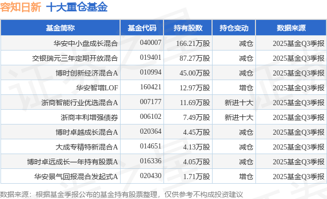 根据2025基金Q3季报公募基金重仓股数据,重仓该股的公募基金共12家,其中持有数量最多的公募基金为华安基金的华安中小盘成长混合。华安中小盘成长混合目前规模为20.0亿元,最新净值3.3361(1月9日),较上一交易日上涨2.33%,近一年上涨19.13%。该公募基金现任基金经理为金拓。金拓在任的基金产品包括:华安智增精选混合,管理时间为2023年10月23日至今,期间收益率为28.1%;华安景气回报混合发起式A,管理时间为2024年9月19日至今,期间收益率为30.36%;