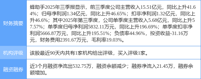 2025年10月31日,太平洋研究员曹佩,王景宜发布了对蜂助手的研报《Q3利润同比高增,定增注入成长动力》,该研报对蜂助手给出“买入”评级。研报中预计公司2025-2027年营业收入分别为20.11/25.64/31.88亿元,归母净利润分别为2.02/2.74/3.44亿元。维持“买入”评级。证券之星数据中心根据近三年发布的研报数据计算,该研报作者对此股的盈利预测准确度为52.94%。