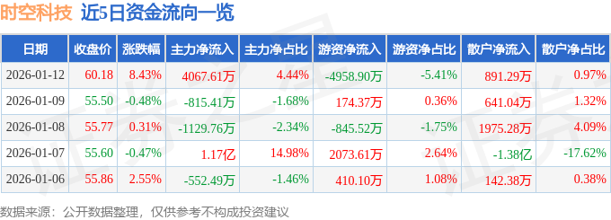 证券之星消息,截至2026年1月12日收盘,时空科技(605178)报收于60.18元,上涨8.43%,换手率15.6%,成交量15.46万手,成交额9.16亿元。