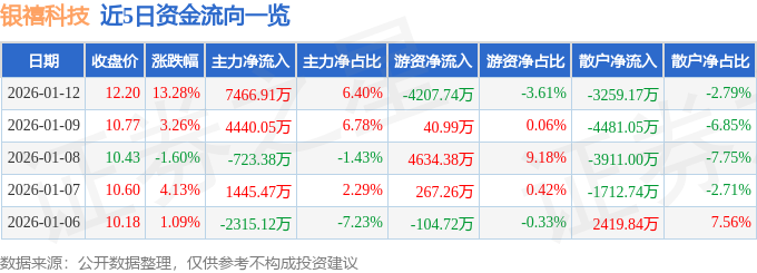证券之星消息,截至2026年1月12日收盘,银禧科技(300221)报收于12.2元,上涨13.28%,换手率21.79%,成交量99.47万手,成交额11.66亿元。