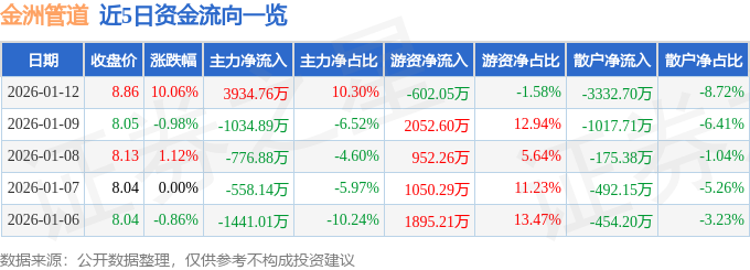 证券之星消息,截至2026年1月12日收盘,金洲管道(002443)报收于8.86元,上涨10.06%,涨停,换手率8.67%,成交量45.05万手,成交额3.82亿元。