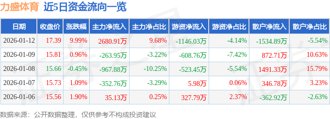 证券之星消息,截至2026年1月12日收盘,力盛体育(002858)报收于17.39元,上涨9.99%,涨停,换手率11.3%,成交量16.6万手,成交额2.77亿元。