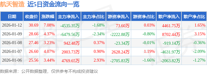 证券之星消息,截至2026年1月12日收盘,航天智造(300446)报收于30.69元,上涨7.08%,换手率23.98%,成交量89.58万手,成交额27.03亿元。