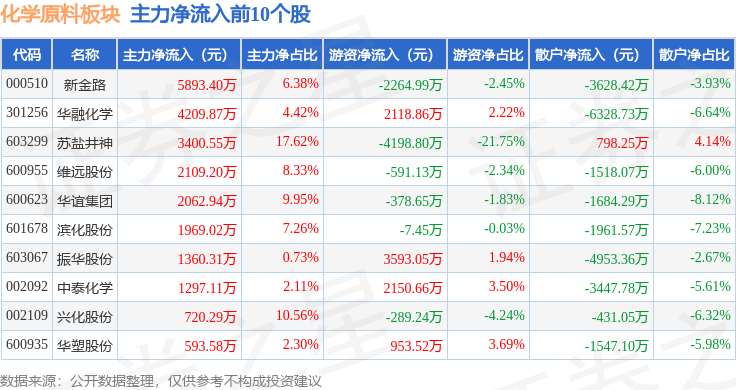 从资金流向上来看,当日化学原料板块主力资金净流出4.38亿元,游资资金净流入1.06亿元,散户资金净流入3.32亿元。化学原料板块个股资金流向见下表: