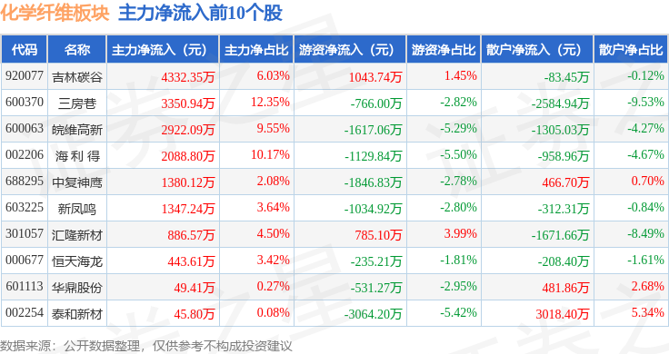 从资金流向上来看,当日化学纤维板块主力资金净流出1.8亿元,游资资金净流出9083.61万元,散户资金净流入2.71亿元。化学纤维板块个股资金流向见下表:
