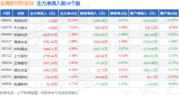 从资金流向上来看,当日金属新材料板块主力资金净流出3.24亿元,游资资金净流入1.36亿元,散户资金净流入1.88亿元。金属新材料板块个股资金流向见下表: